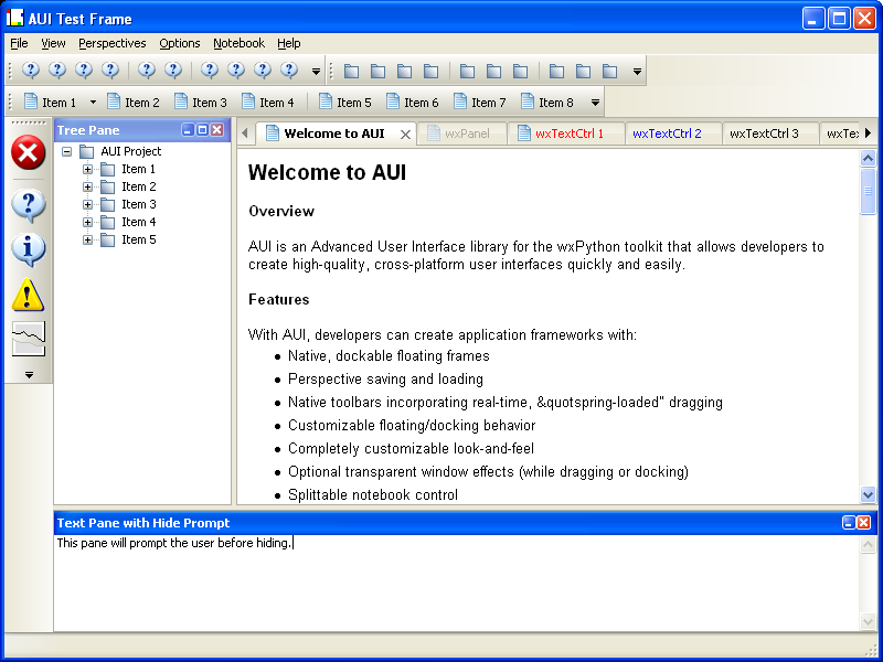 - Panes can be docked on top of each other to form AuiNotebooks; AuiNotebooks tabs can be torn off to create floating panes;
