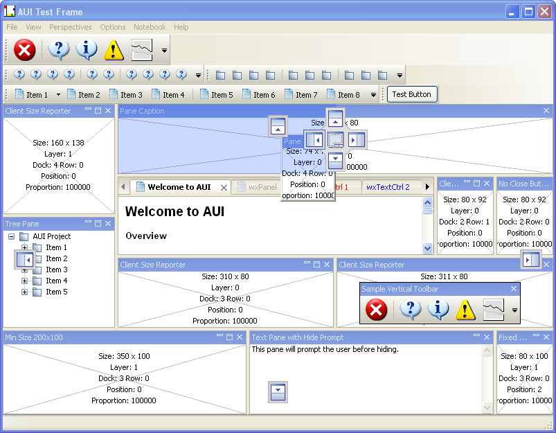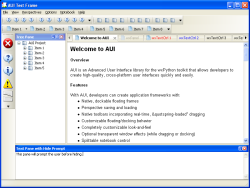- Implementation of a simple minimize pane system: Clicking on this minimize button causes a new AuiToolBar to be created and added to the frame manager, (currently the implementation is such that panes at West will have a toolbar at the right, panes at South will have toolbars at the bottom etc...) and the pane is hidden in the manager. Clicking on the restore button on the newly created toolbar will result in the toolbar being removed and the original pane being restored;