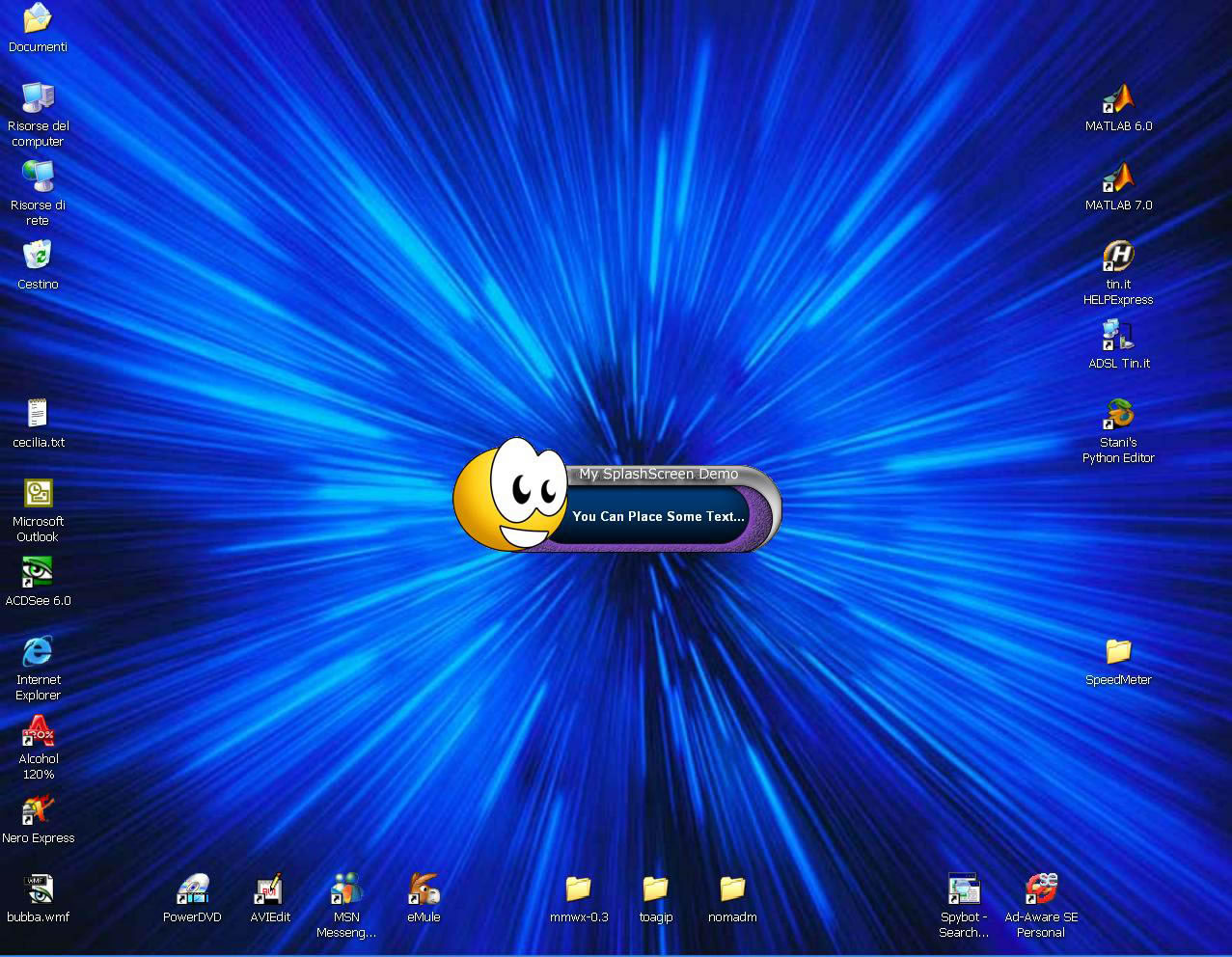 AdvancedSplash is a control written in wxPython that reproduce somewhat the behavior of wx.SplashScreen, but with some more functionalities. It is possible to set the shape of the splash screen, accordingly to the input image, and adding text in runtime to simulate some loading progress.