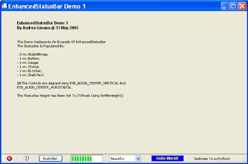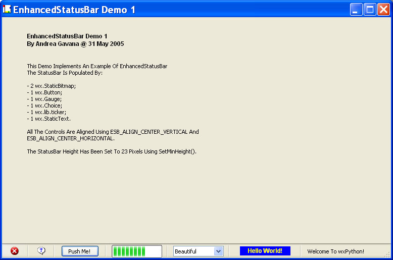 This class is an extension of the wx.StatusBar in the wxPython distribution. It allows the user to insert virtually every wxPython control inside the status bar of a frame. It is highly customizable, with a lot of options.