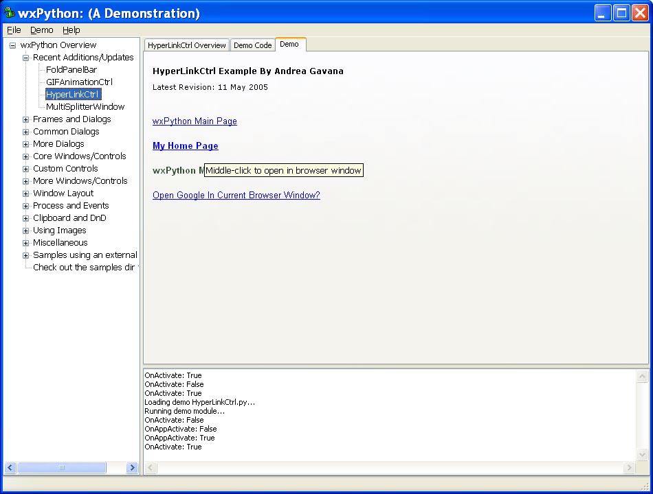 HyperLinkCtrl is a Python class that uses wxPython GUI front-end. It has been integrated into the standard wxPython library distribution since version 2.6.0.1, dated 30 May 2005.