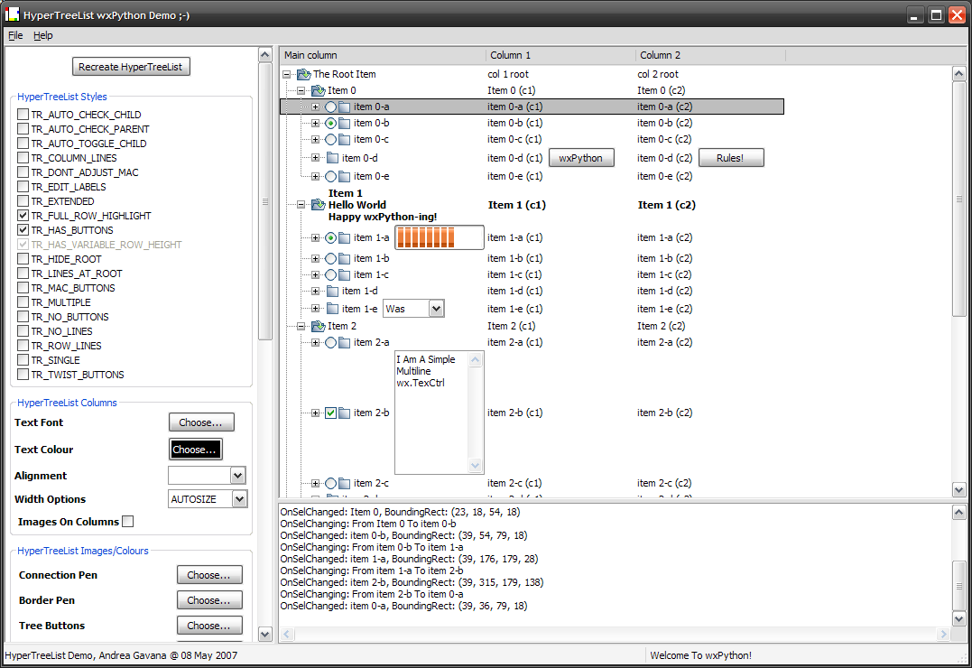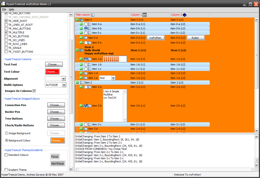 HyperTreeList is a class that mimics the behaviour of wx.gizmos.TreeListCtrl, with almost the same base functionalities plus some more enhancements. This class does not rely on the native control, as it is a full owner-drawn tree-list control.