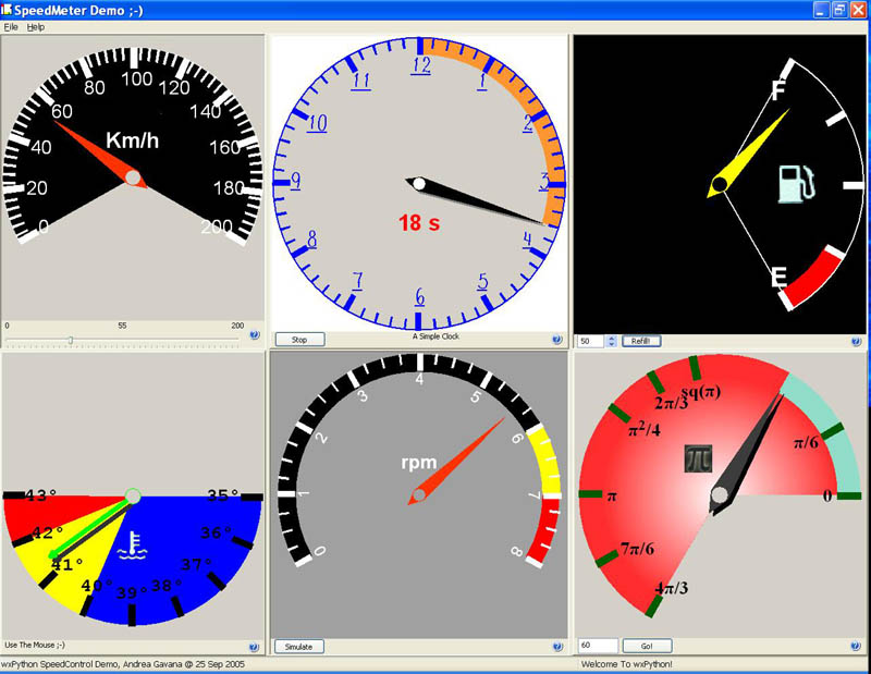 SpeedMeter is a control written in wxPython that allows you to simulate angular controls like car speed/fuel/oil/RPM controls, temperature indicators, clocks and whatever similar comes to your mind. It is highly customizable.