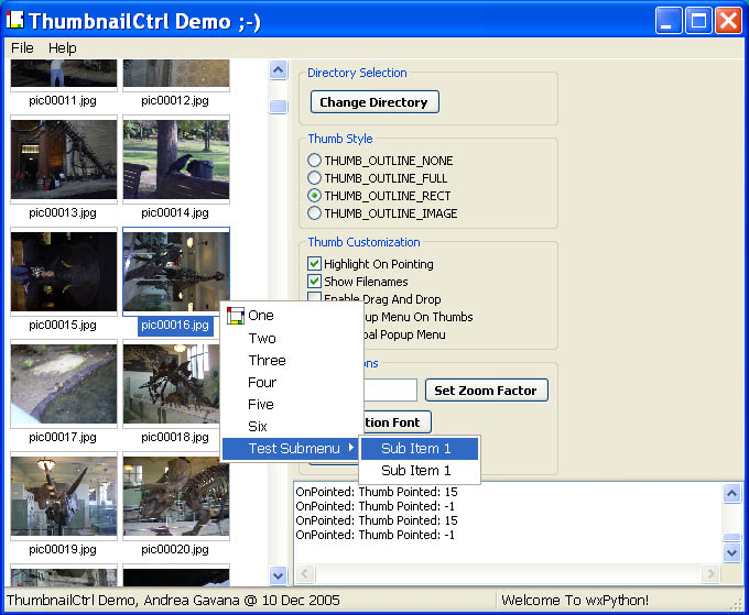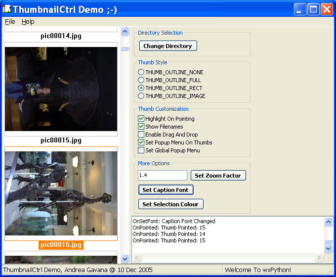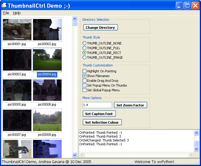 ThumbnailCtrl is a widget, written in wxPython, that can be used to display a series of images in a "thumbnail" format; it mimics, for example, the Windows Explorer behavior when you select the "View Thumbnails" option. Basically, by specifying a folder that contains some image files, the files in the folder are displayed as miniature versions of the actual images in a wx.ScrolledWindow.