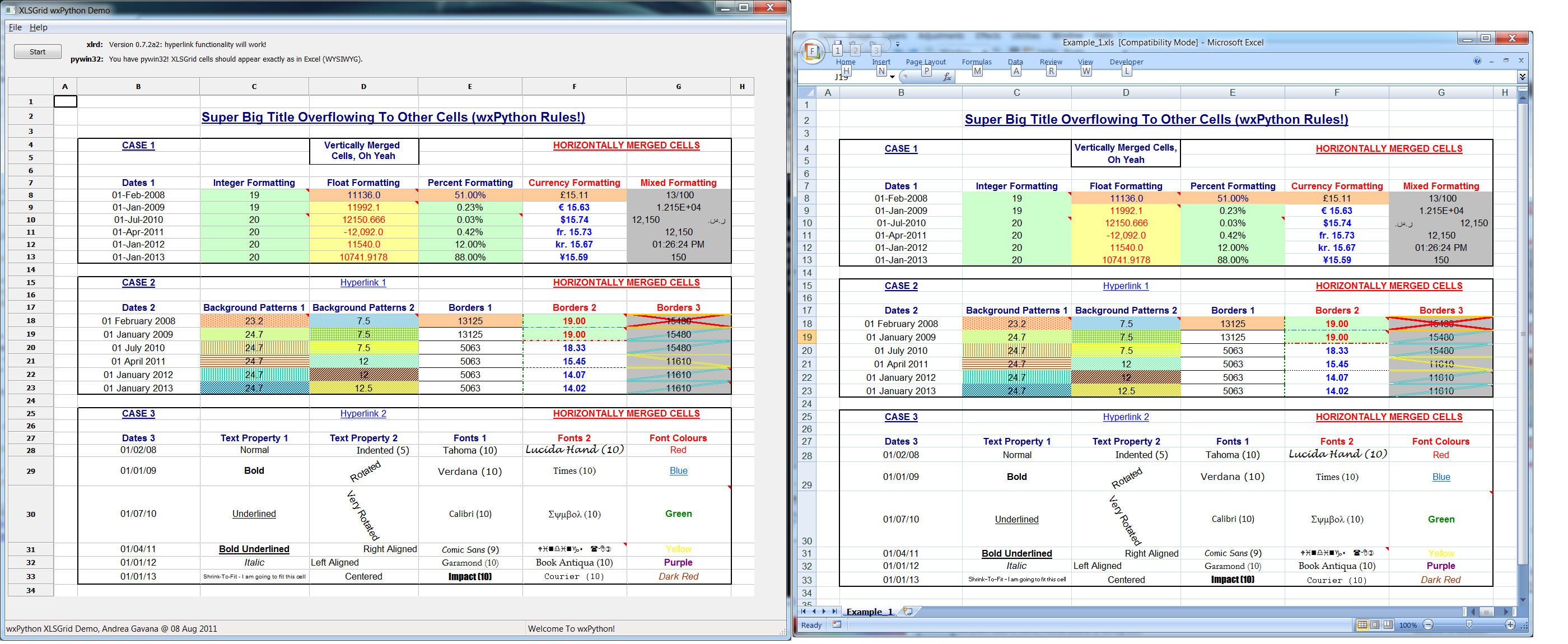 - Cell text appearance: if you are using Mark Hammonds' `pywin32` package, the text displayed in the XLSGrid cells has exactly the same appearance as in the Excel spreadsheet.